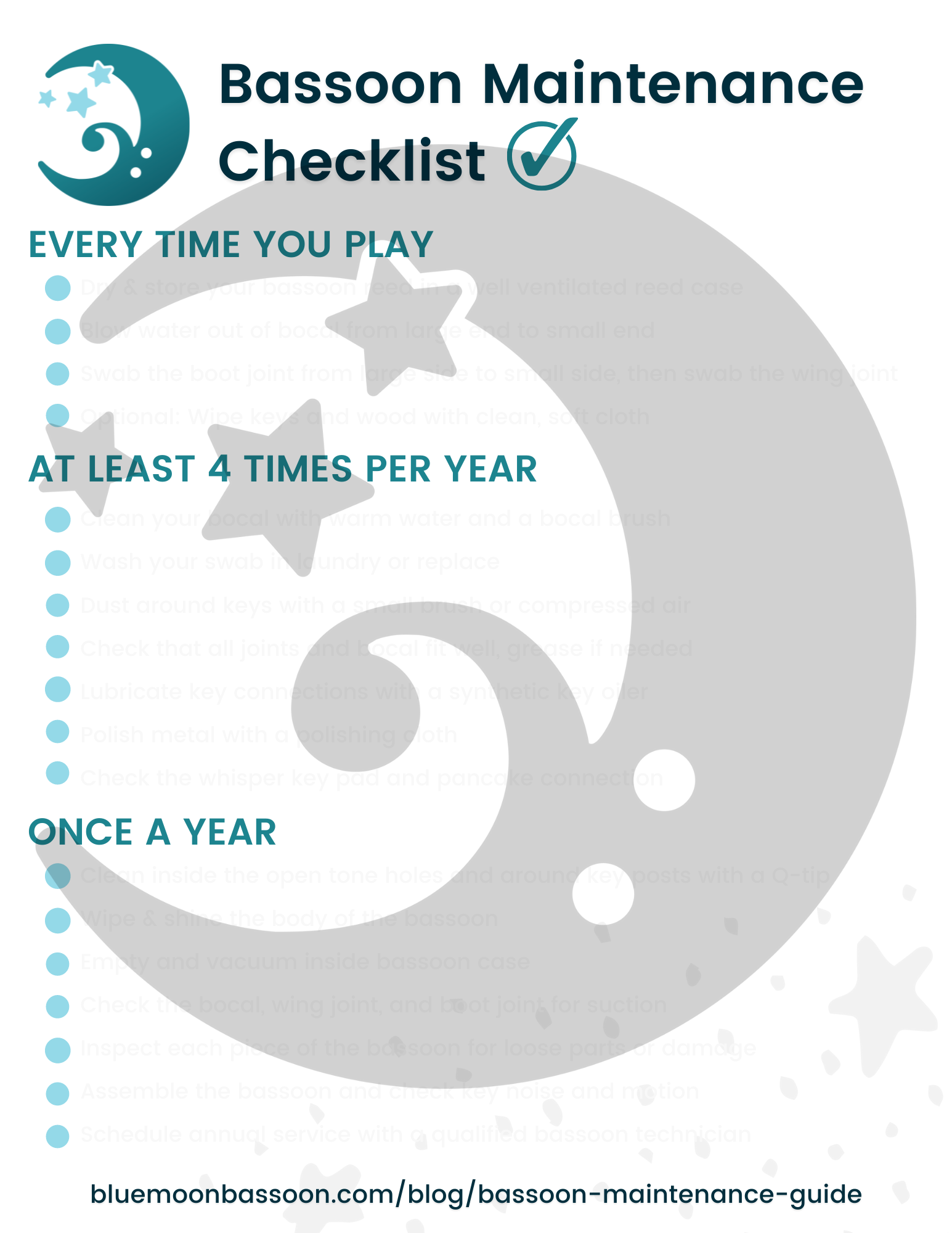 Bassoon Maintenance Checklist Sign up with your email address to receive this free bassoon maintenance guide with an easy daily, quarterly, and annual maintenance checklist. Avoid major bassoon repairs and ensure your bassoon plays effortlessly! Email Address Get the Checklist Unsubscribe anytime! Your information will be kept private π Thanks for signing up! Check your inbox (and spam folder!) for an email with your free download from hello@bluemoonbassoon.com.