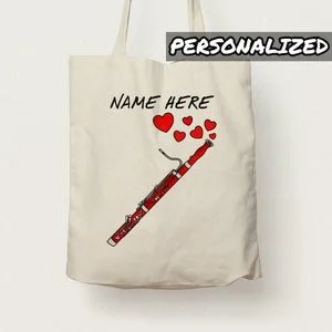 This personalized bassoon canvas tote bag features my doodle of a bassoon, with hearts and personalized text! Ideal for bassoon players (bassoonist, bassoon teacher, woodwind teacher, wedding musician) and anyone who loves music, this custom bassoon tote bag is perfect for Valentines day, anniversaries, birthdays, concerts, weddings or any other occasion!