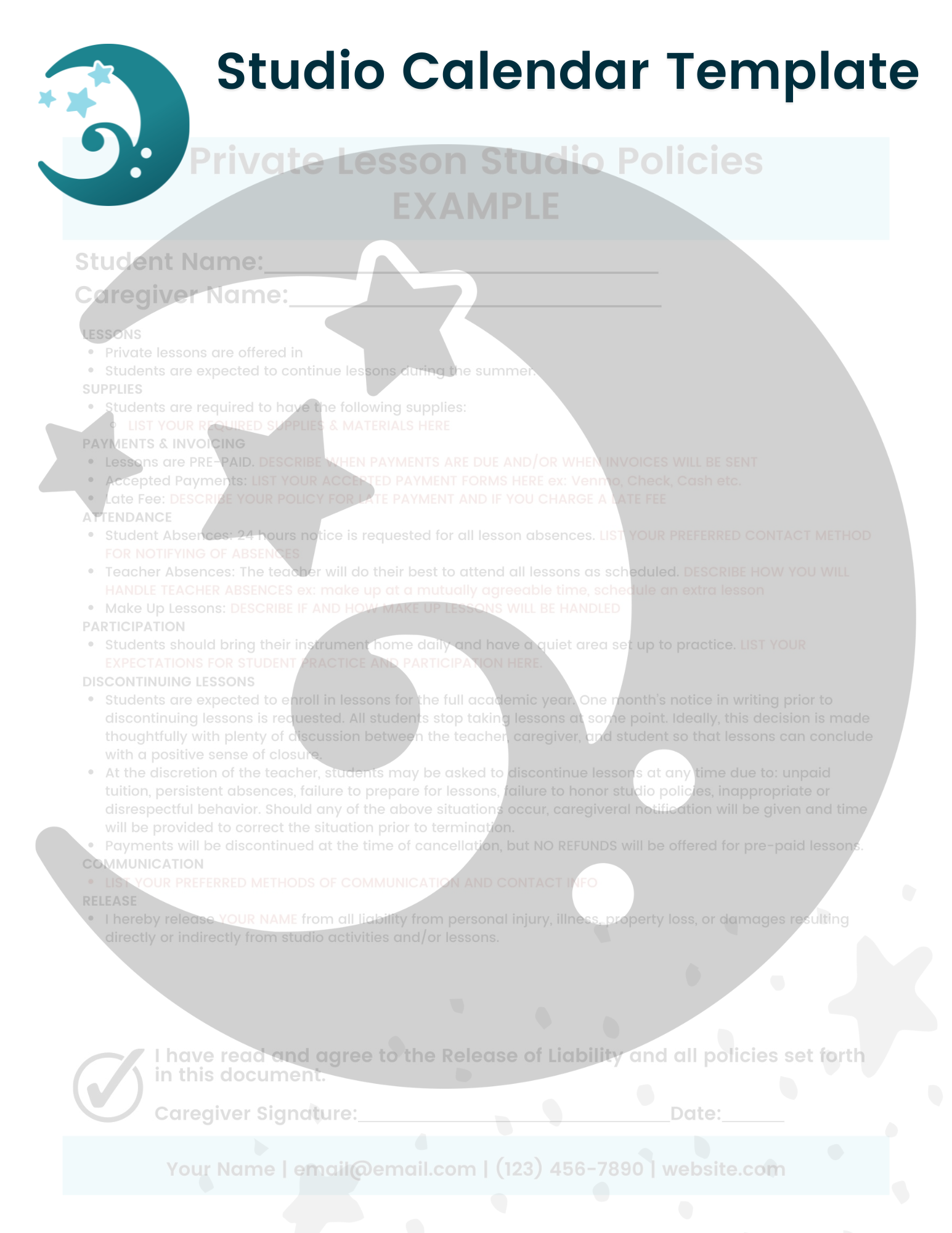 Studio Policies & Calendar Template Sign up with your email address to receive this free studio lesson policies template, designed by Blue Moon Bassoon. This easy-to-edit template includes suggested policies for payments, attendance, make-up lessons, materials, and a 12 month studio calendar. Email Address Get the Template Unsubscribe anytime! Your information will be kept private 💌 Thanks for signing up! Check your inbox (and spam folder!) for an email with your free download from hello@bluemoonbassoon.com.